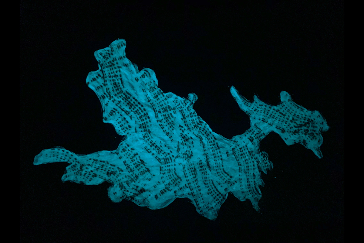 “其岛形如鸟,岛上遍地鲜花”是花鸟岛取名的由来。而荧光海正是对岛上风光的期待,但荧光海这一现象是短暂又难遇见的。 作品取材于岛屿本身的石块,加之荧光材料,傍晚时分会将白天吸收的光慢慢释放出来,将荧光海的短暂但美好的一面再现。与荧光海现象不同的是,作品只有在白天吸收光线越多的情况下,夜晚时分所呈现出的色彩才会越亮。