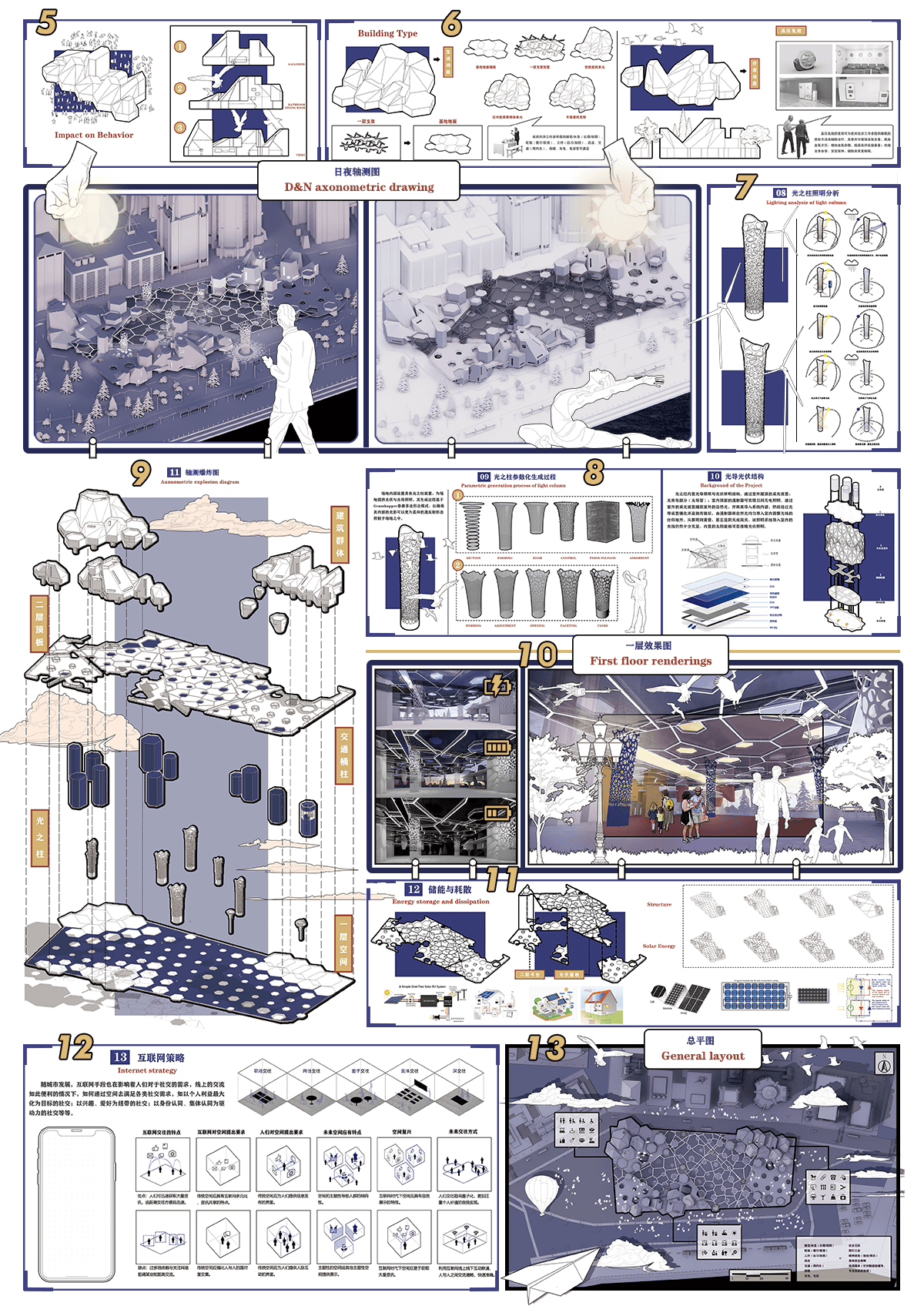 夜间工作者旺盛的活动需求与夜间公共空间之间的矛盾促使着城市基建的进步,本设计从物质性、社交互动和个人感情等方面探索夜晚空间的不同体验,解决现代城市中存在的实际问题,侧重夜间工作者的社交需求和现存空间矛盾,以类型学、光导、光伏照明为概念,设立夜间综合体。