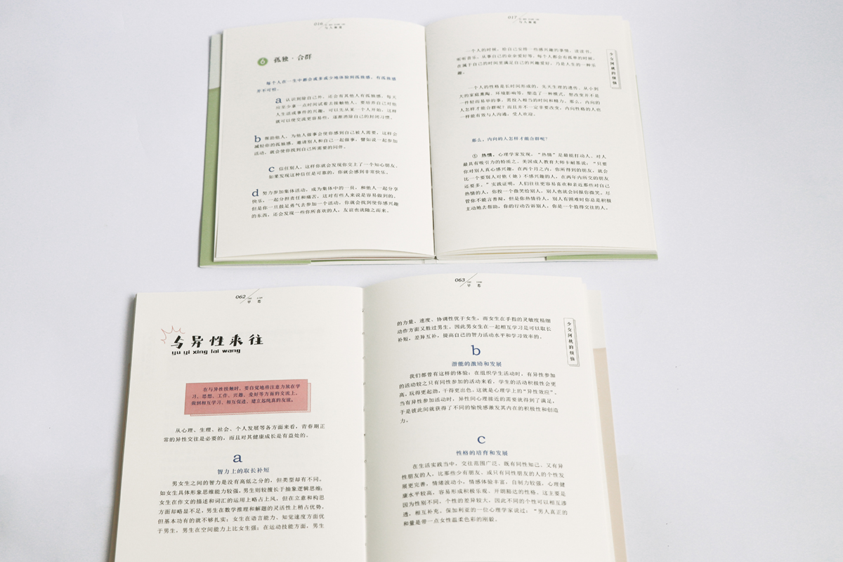 以书籍为载体,利用插图及对版式的推敲,重新梳理文本,传达并帮助解决青春期女孩成长过程中遇到的一些小问题。通过对版式的规划让读者更容易阅读内容,引导她们对自己、对周围的人、对社会、对未来做出客观的认识和评价。